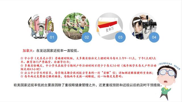 我們可以看到加拿大的近視率一直維持很低,中小學,尤其是小學課堂時間短,更多的時間讓孩子到戶外去,給孩子真正的童年。教育部門嚴禁拖堂,不允許拖堂時間,也不允許補課。在加拿大省份里都強調每天戶外活動時間不能少于兩小時。所以這三個國家都一致的強調每天增加戶外活動。
