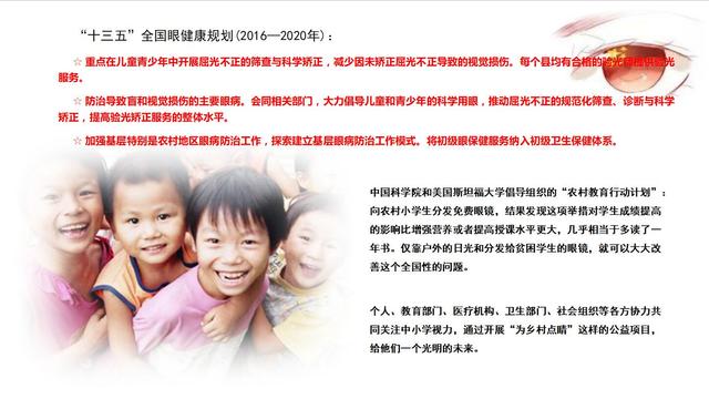 全國十三五健康規(guī)劃,其中包括眼健康規(guī)劃,在眼健康規(guī)劃的十幾條當中涉及到兒童有9條,這里提出來三條是我們應該關注的。