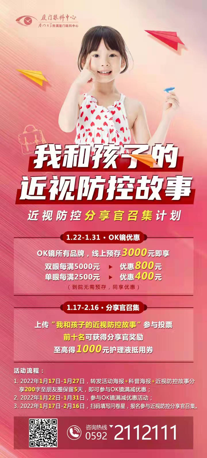 轉(zhuǎn)發(fā)活動海報+科普海報,并分享近視防控故事(不少于200字)至朋友圈保留5天,即可解鎖福利二優(yōu)惠。(開頭需帶話題#我和孩子的近視防控故事)活動時間:2022年1月17日-1月27日