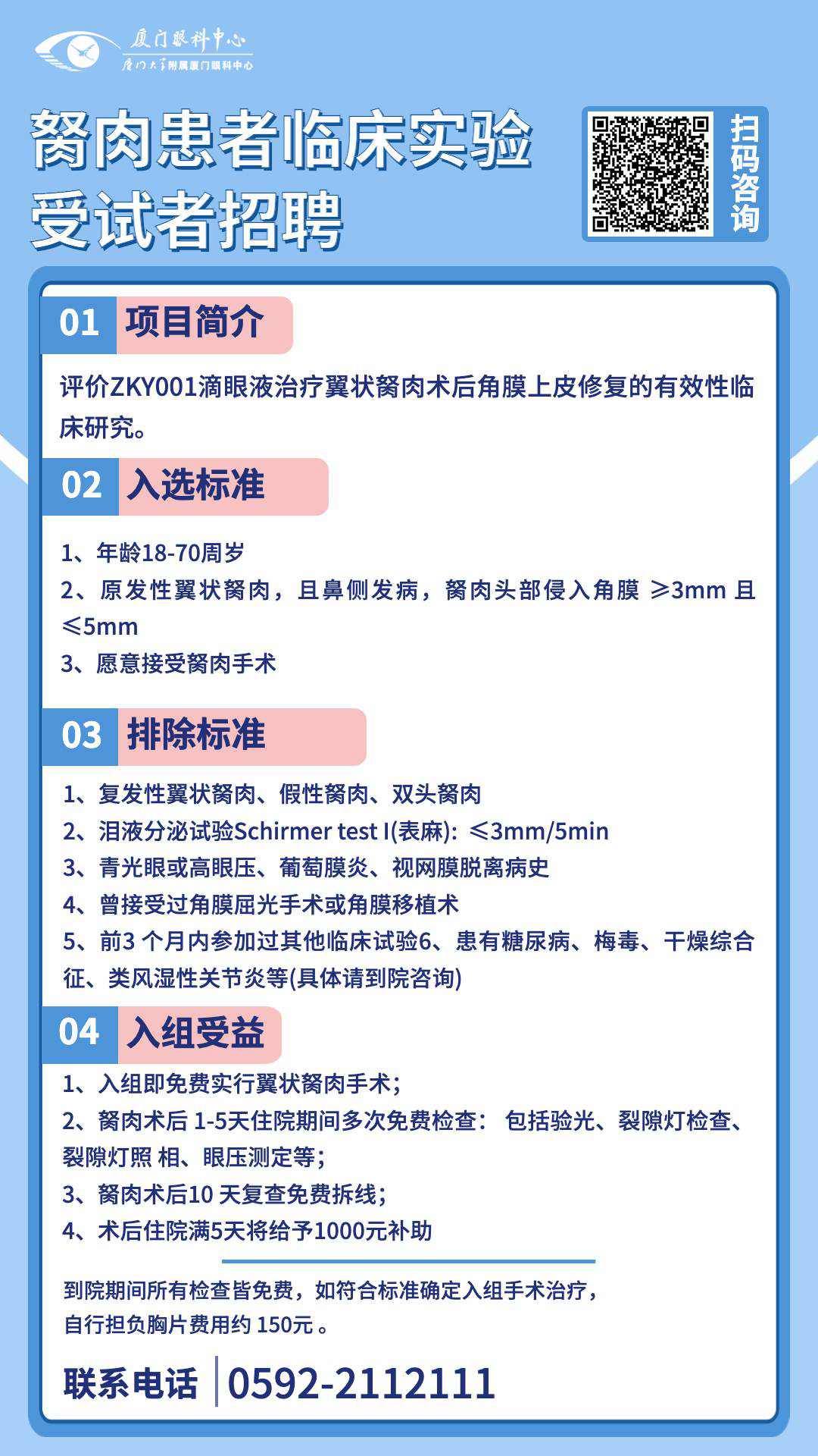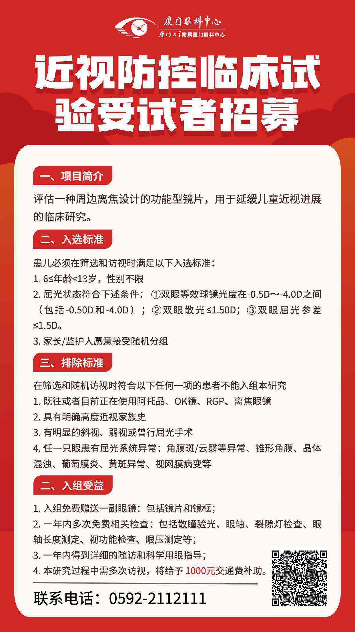本次研究對(duì)受試者的個(gè)人信息將嚴(yán)格保密,所獲的所有信息將僅作研究分析之用。如果有可能符合以上條件或想了解更多信息的朋友,可以通過(guò)以下方式咨詢(xún):0592-2112111
