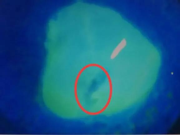 老楊右眼術前熒光造影照片—紅色圓圈中黑色區(qū)域為角膜穿孔的部分