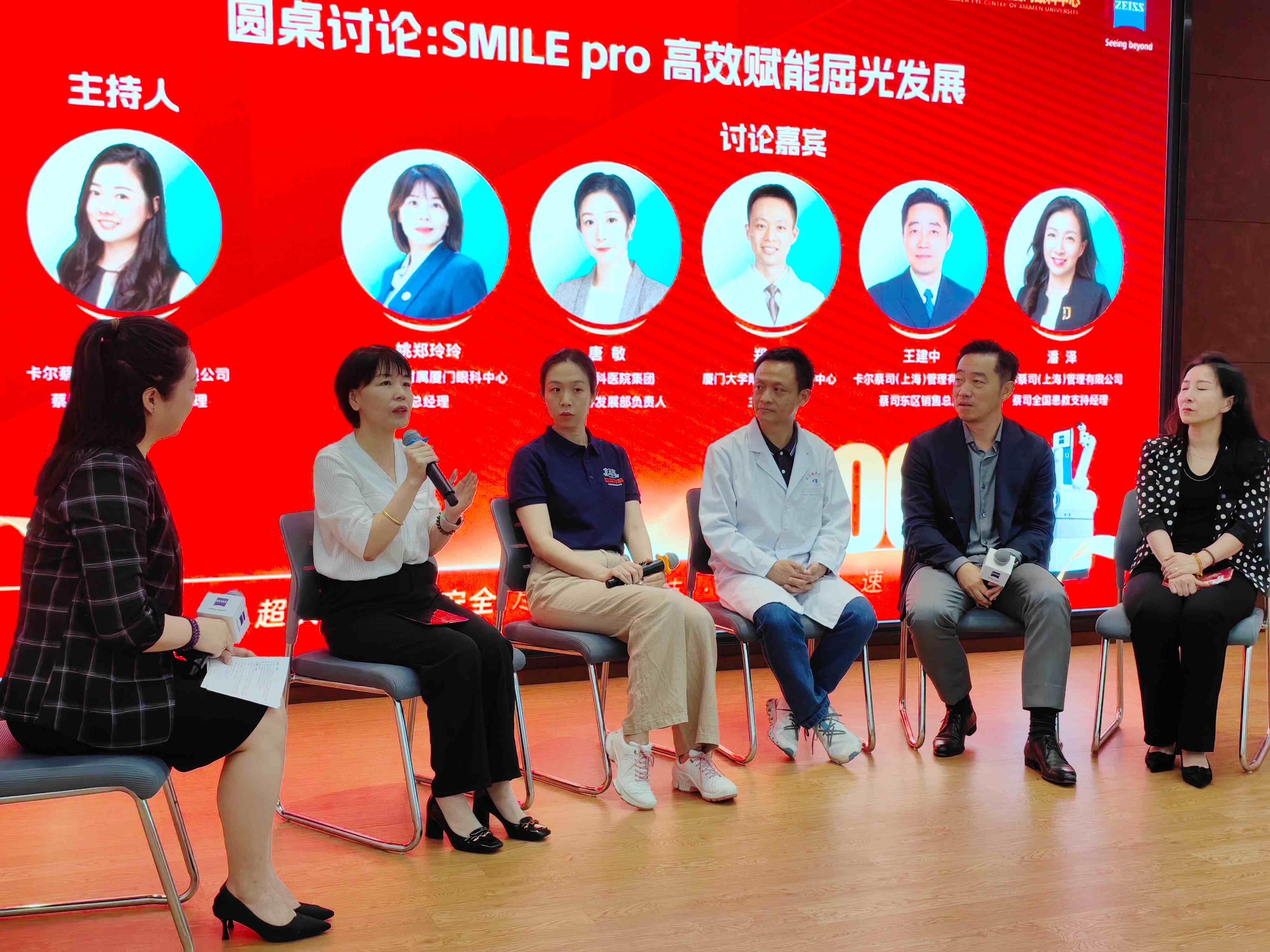 廈門眼科中心總經(jīng)理姚鄭玲玲、華廈眼科醫(yī)院集團屈光學科發(fā)展部負責人唐敏、廈門眼科中心屈光科主任醫(yī)師鄭林、蔡司眼科大東區(qū)銷售總監(jiān)王建中、蔡司醫(yī)療屈光全國患教經(jīng)理潘澤等嘉賓,圍繞SMILE Pro技術(shù)在屈光領(lǐng)域的應用現(xiàn)狀、未來發(fā)展、提升手術(shù)質(zhì)量與患者體驗等議題展開深度探討: